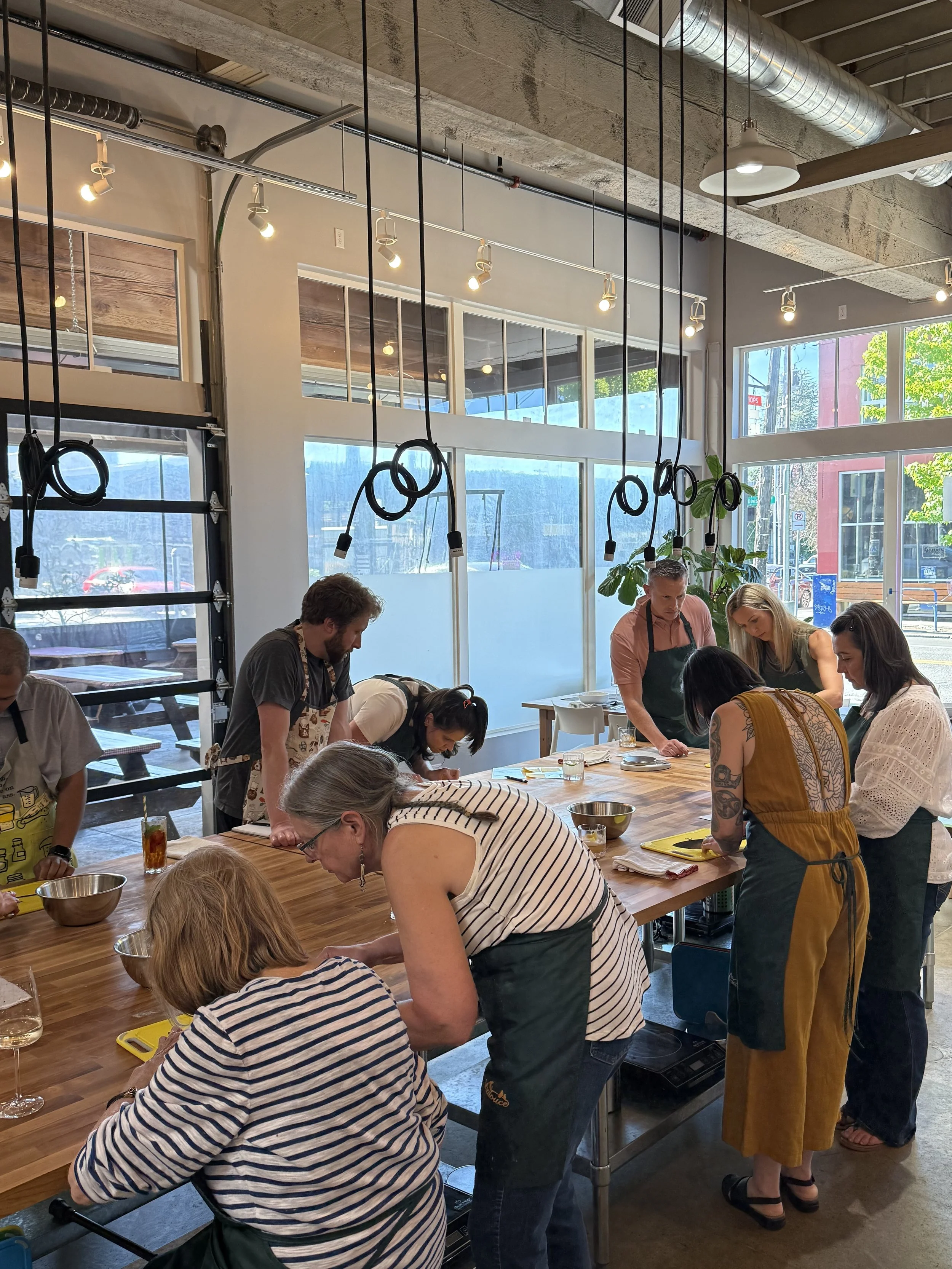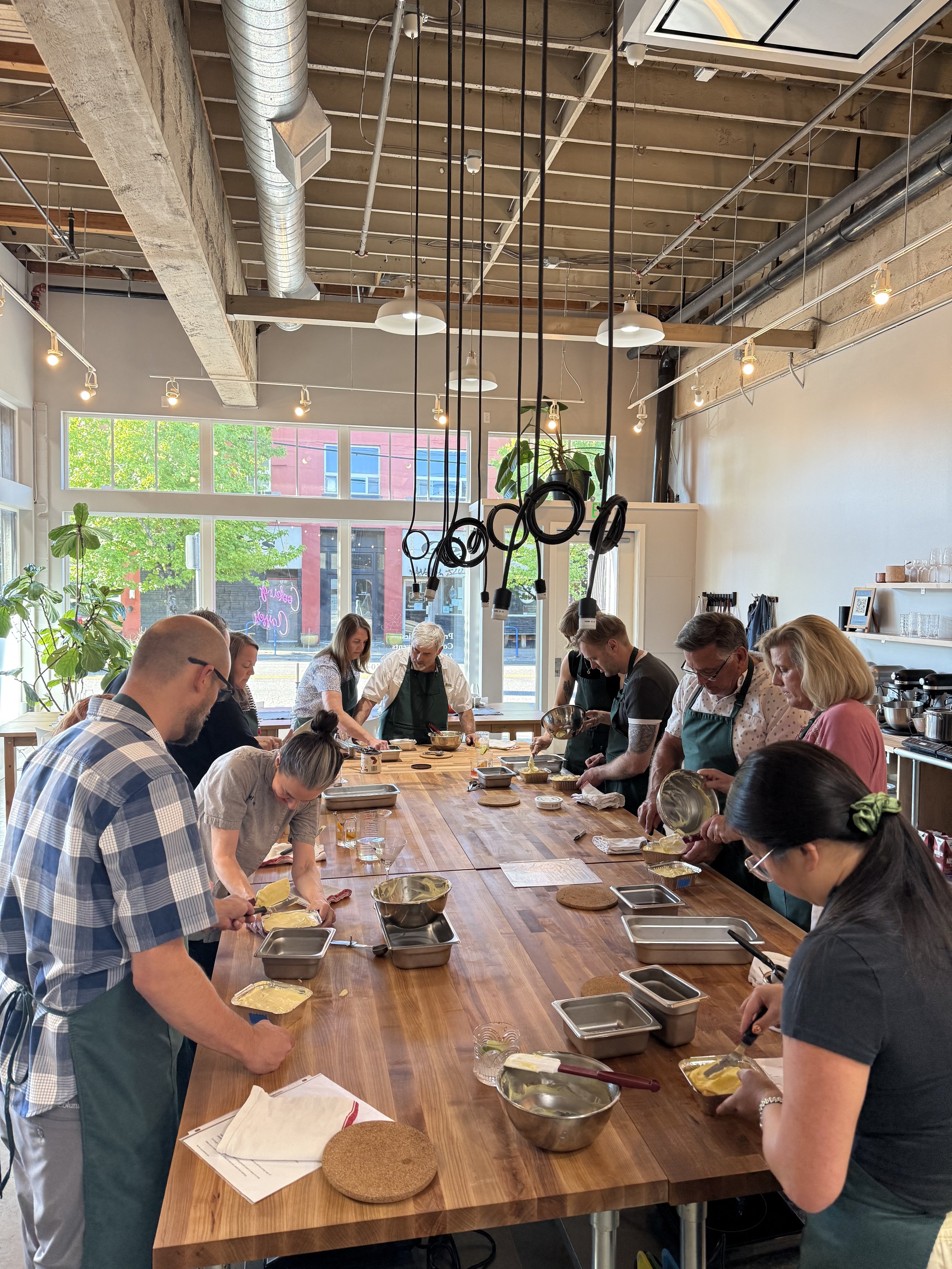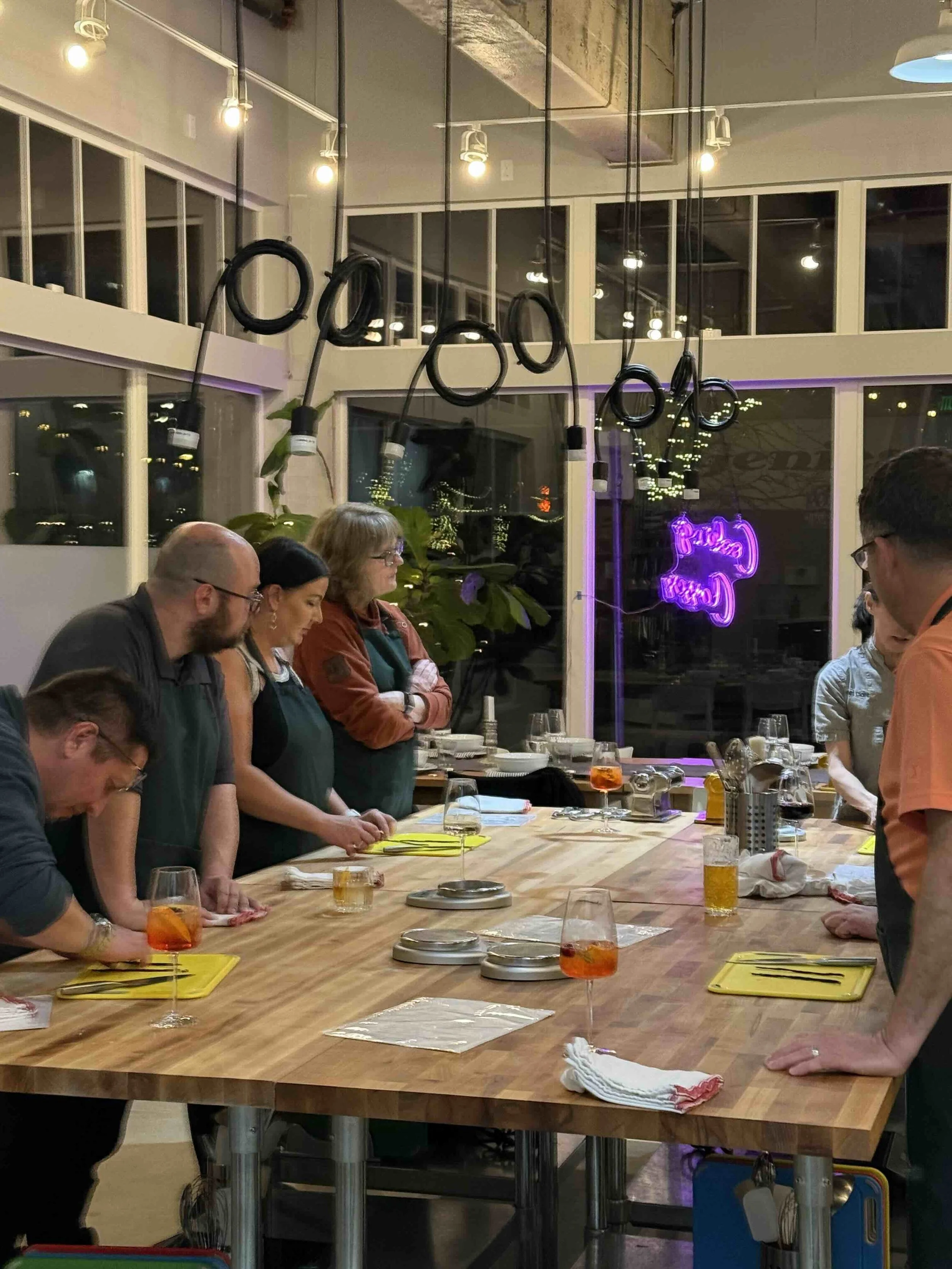 Group of people participating in a cooking class around a wooden table with bowls, glasses, and utensils, inside a kitchen with large windows showing parked cars outside.