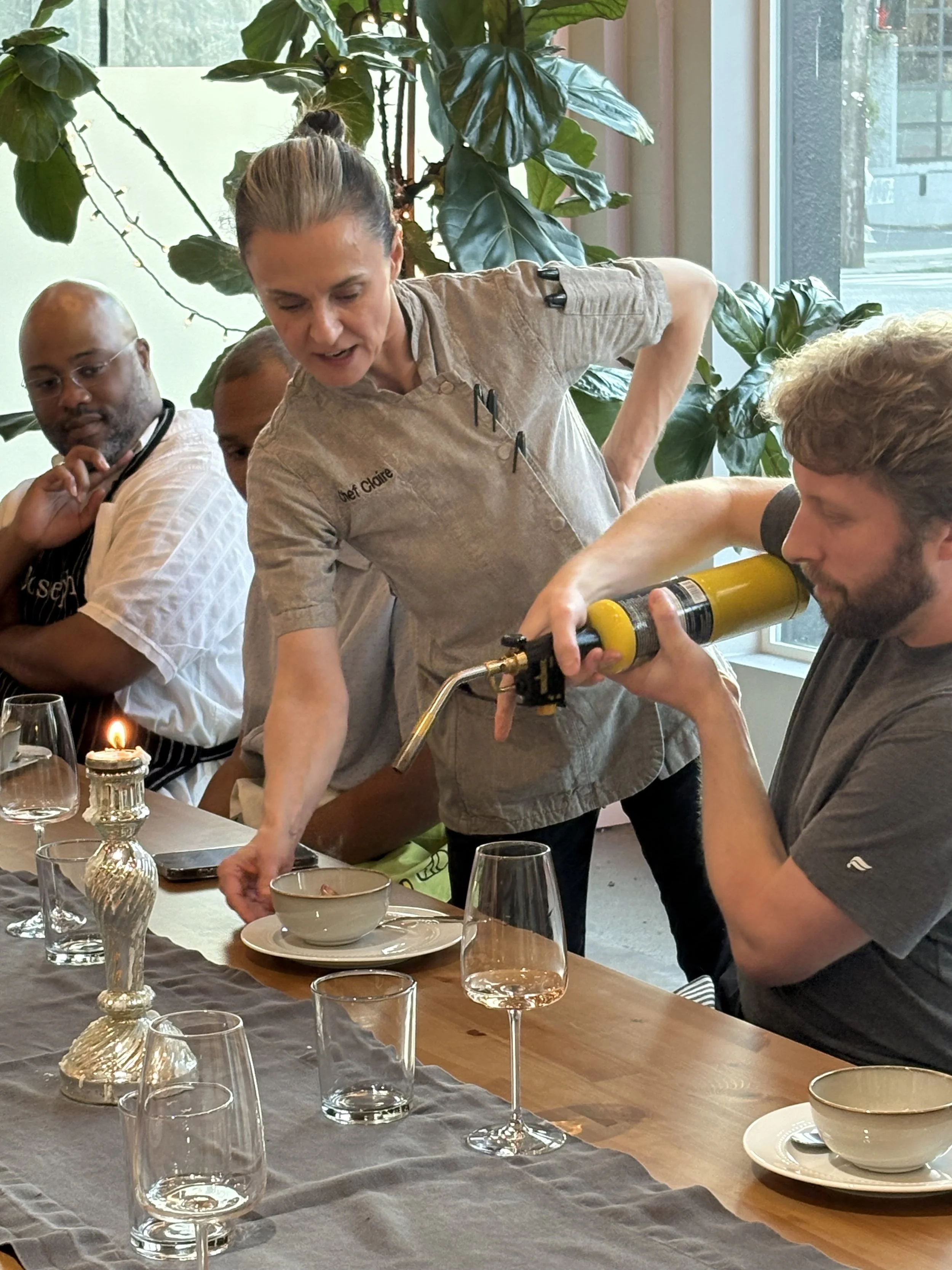 A woman with tattoos on her arms and chest, wearing a black apron over a yellow top, is using a blowtorch over a small dish at a table in a kitchen or dining area. There are glasses, a small dish, and an orange pitcher on the table, with large green