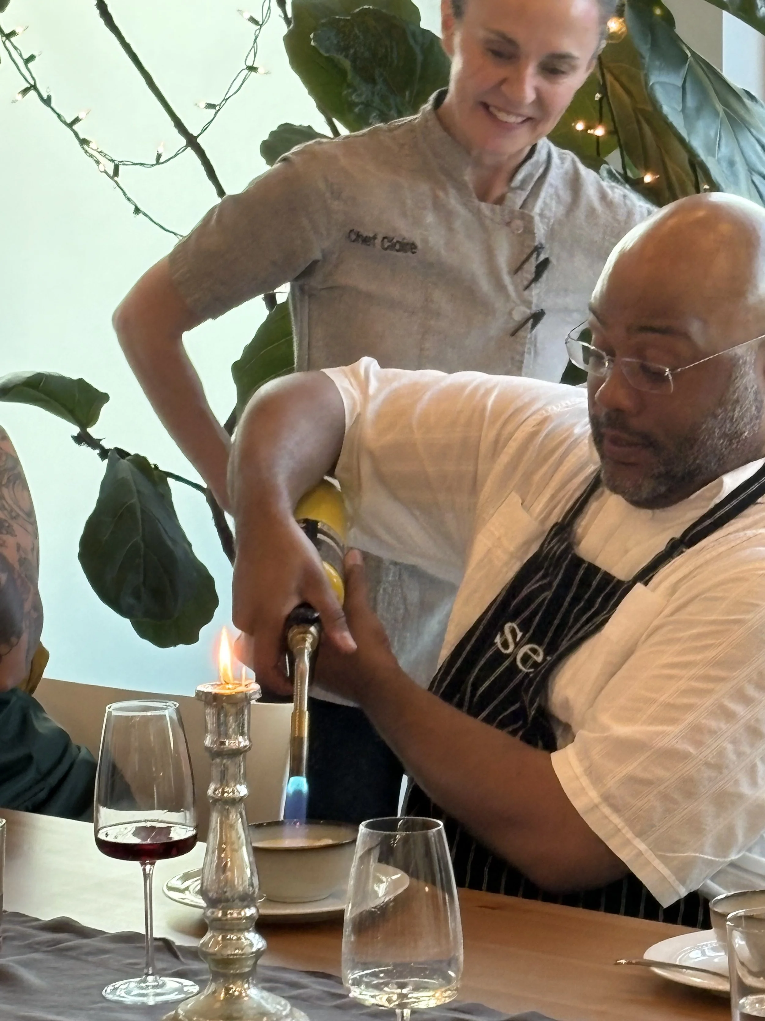 A chef demonstrates a flaming culinary technique while a woman watches and smiles. The scene is set at a dining table with wine glasses, a candle, and dining utensils, with large green indoor plants and string lights in the background.