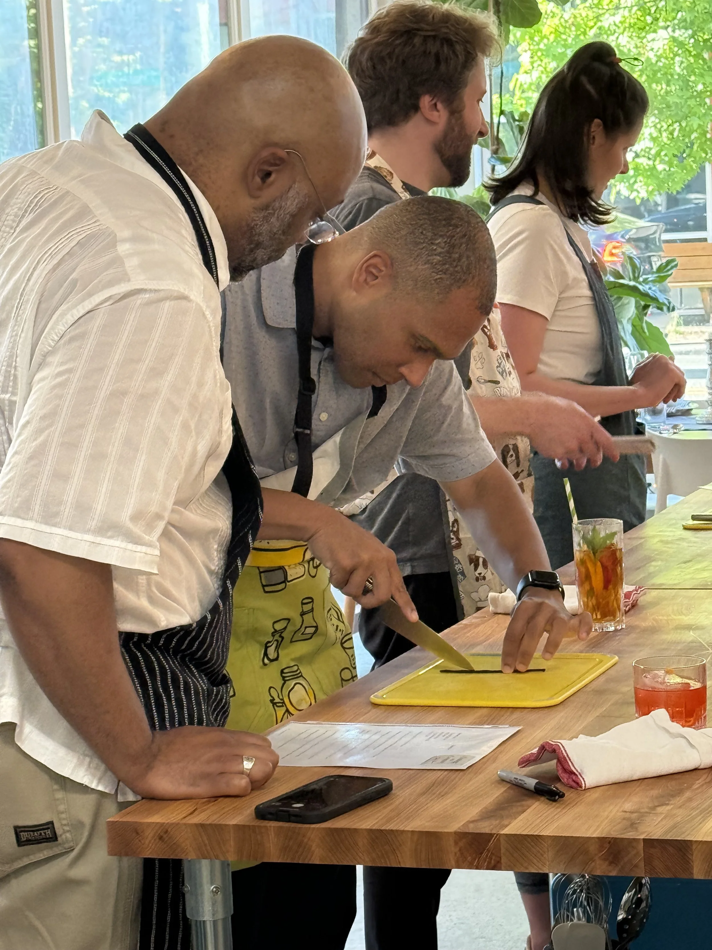 Four adults participating in a cooking class, chopping ingredients on a yellow cutting board at a wooden table with drinks, papers, and utensils, standing by a large window with greenery outside.