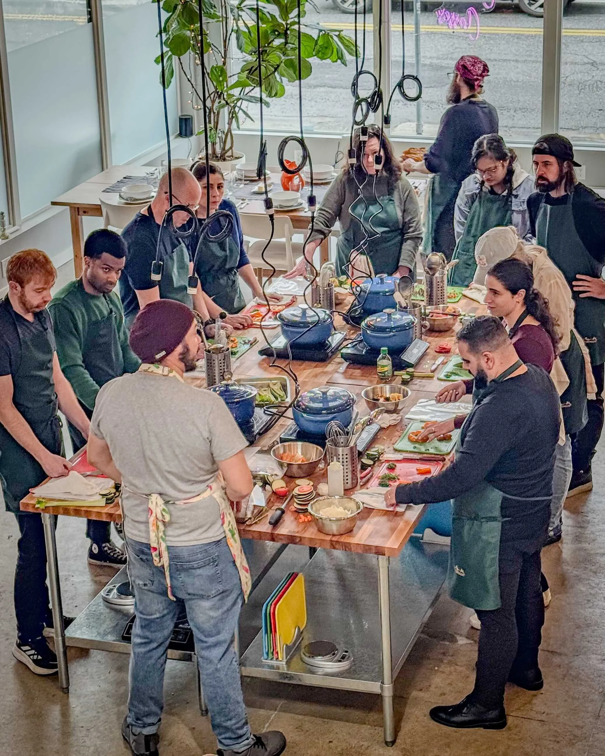 Group of people participating in a cooking class around a large wooden table, with ingredients and bowls, in a bright, modern kitchen with large windows.