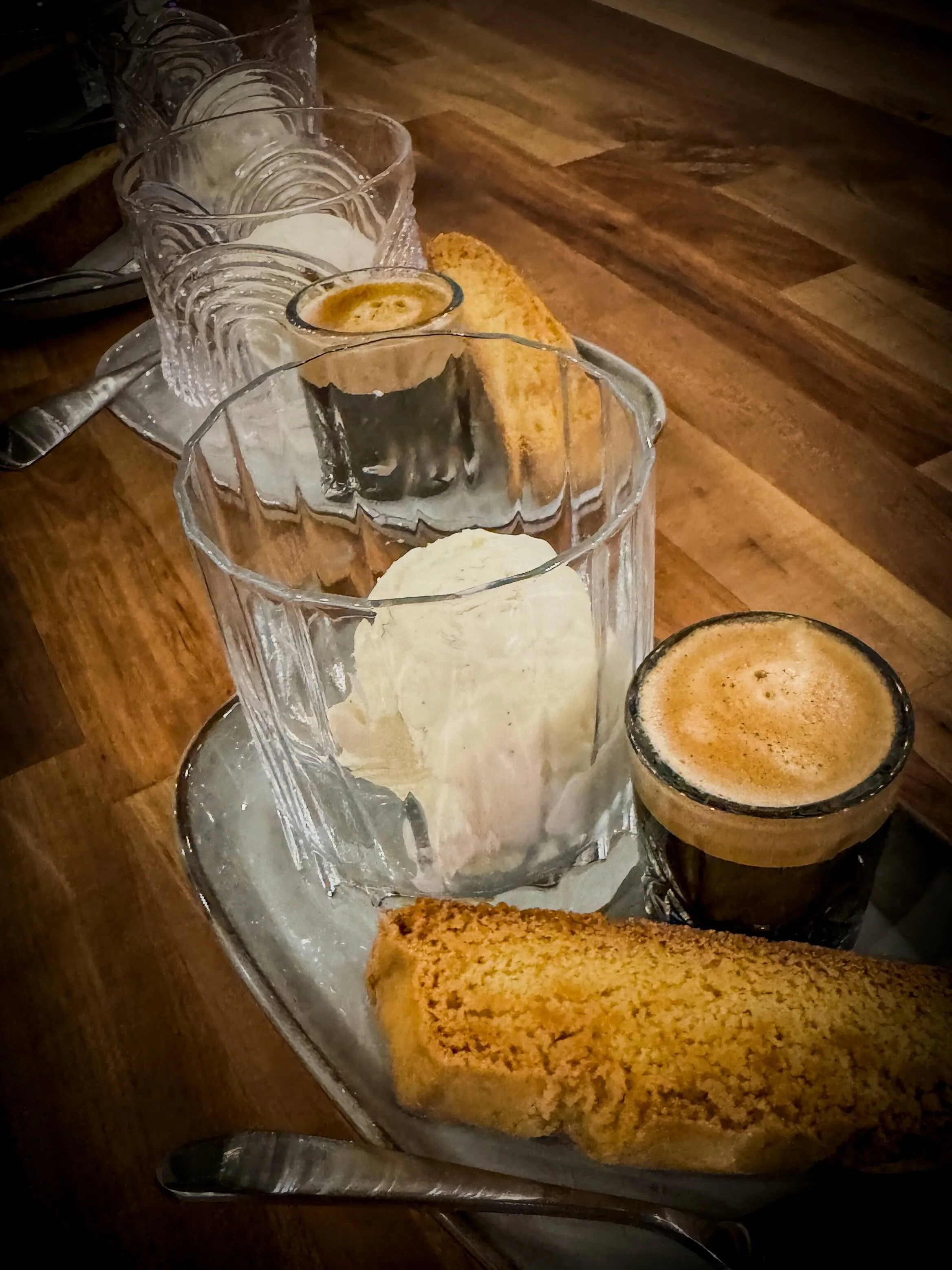 A tray with three glasses of espresso, a glass bowl containing vanilla ice cream, and two slices of toasted bread on a wooden table.